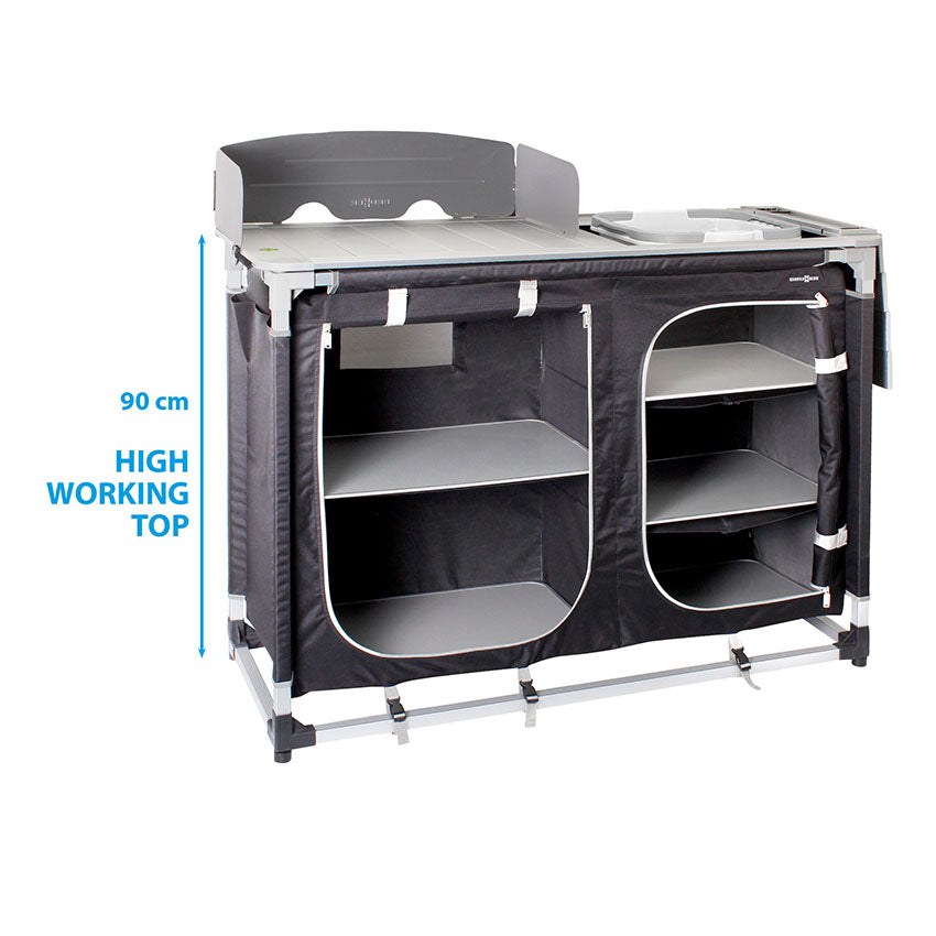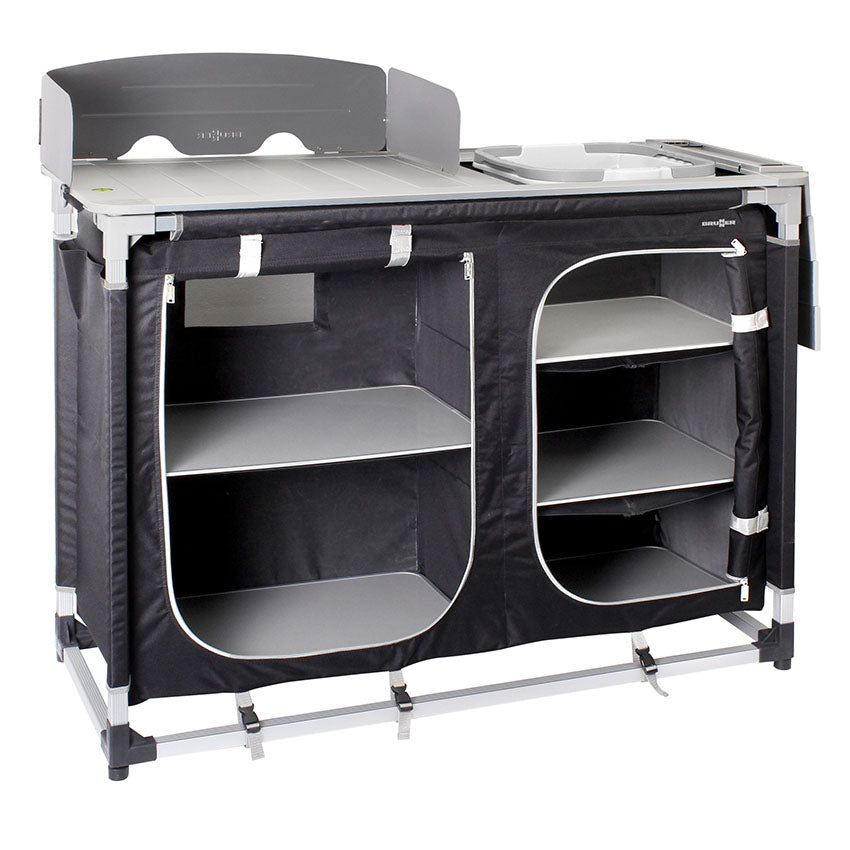 Brunner Azabache CTW Square HWT je praktična kamp kuhinja sa integrisanom, uklonjivom sklopivom sudoperom i dva velika odjeljka za odlaganje hrane i kuhinjskog pribora. Ima veliku aluminijumsku rolo radnu površinu i noge podesive po visini, tako da se može stabilno postaviti i na neravnim podlogama.